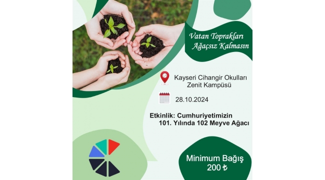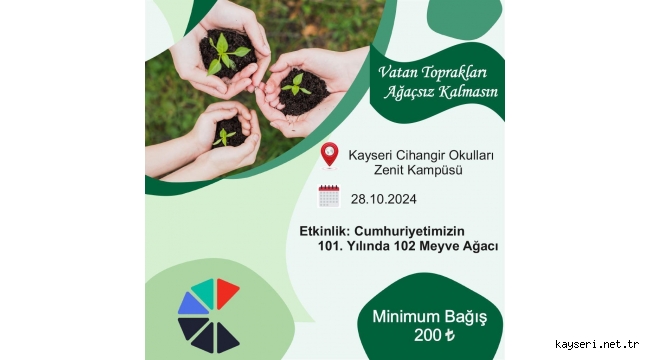 Kayseri Cihangir Okulları, Cumhuriyetimizin 101. yılına özel anlamlı bir projeye imza atıyor. Tarih Öğretmeni Mehmet Özmen öncülüğünde başlatılan "Vatan toprakları ağaçsız kalmasın" sloganıyla hayata geçirilen proje, Cumhuriyetin 101. yılında 102 meyve ağacının dikilmesini hedefliyor. Bu proje, öğrencilere milli bilinç aşılamak ve çevre duyarlılığını artırmak amacıyla geliştirildi.