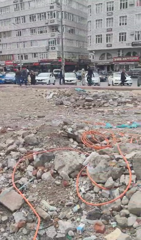 Yıkıldığı gibi bırakılıyor, kablolar, molozlar, şehrin merkezinde çöplük gibi duruyor.